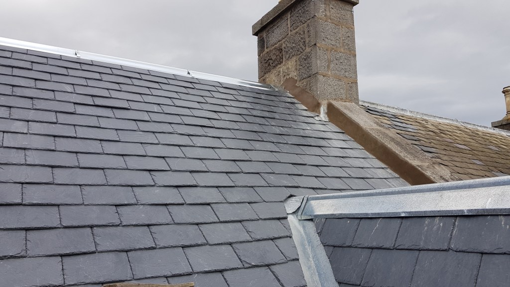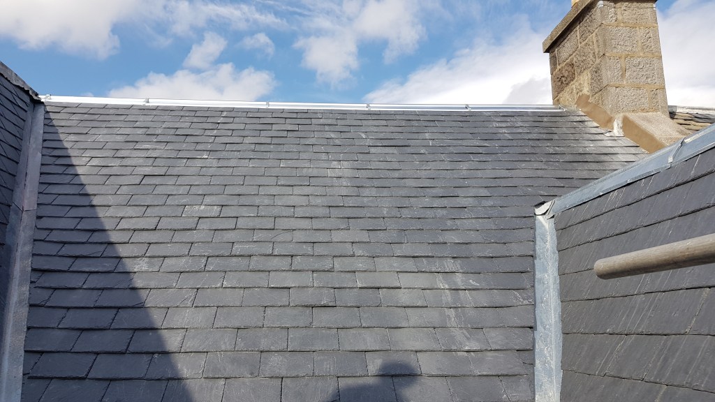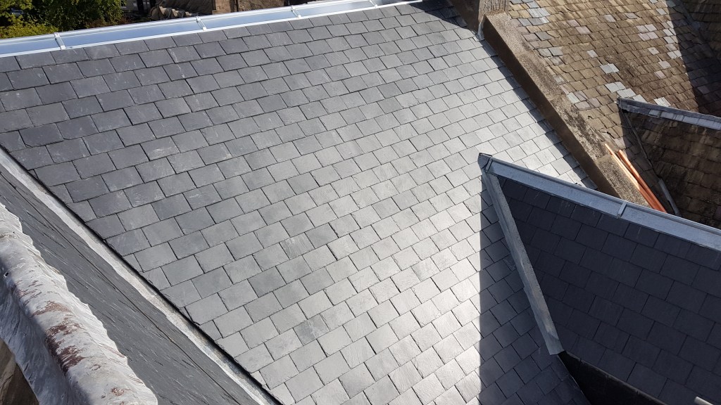 Had to start from scratch and strip and re-slate the entire roof using the existing new Spanish slates that you can see in the pictures.