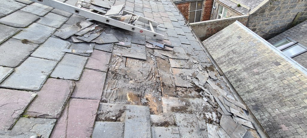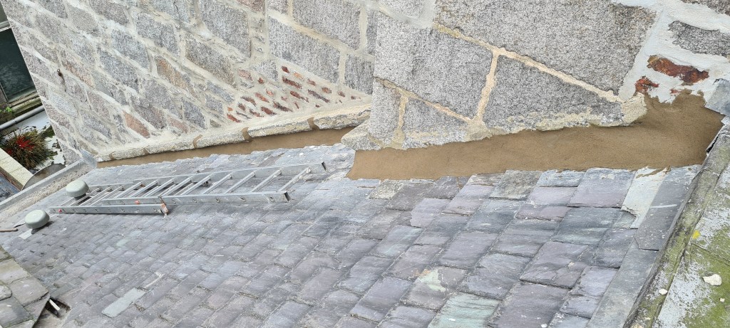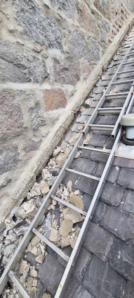 This job had a lot of broken slates and the roof was in a bad state of repair as was the cement skews as well. Skews are the cement work where the slates meet the coping stones at end of roof.
