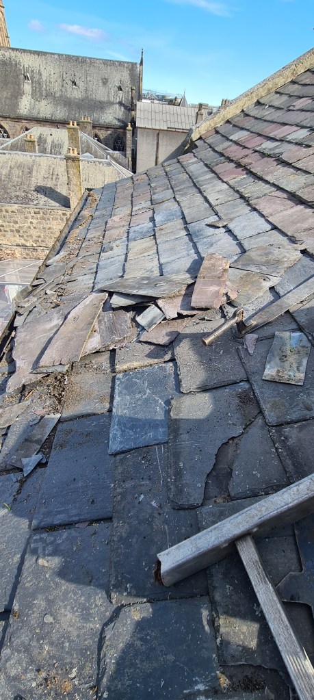 The job involved replacing broken slates for matching new slates and re-doing the skews by removing old cement and re-pointing.
