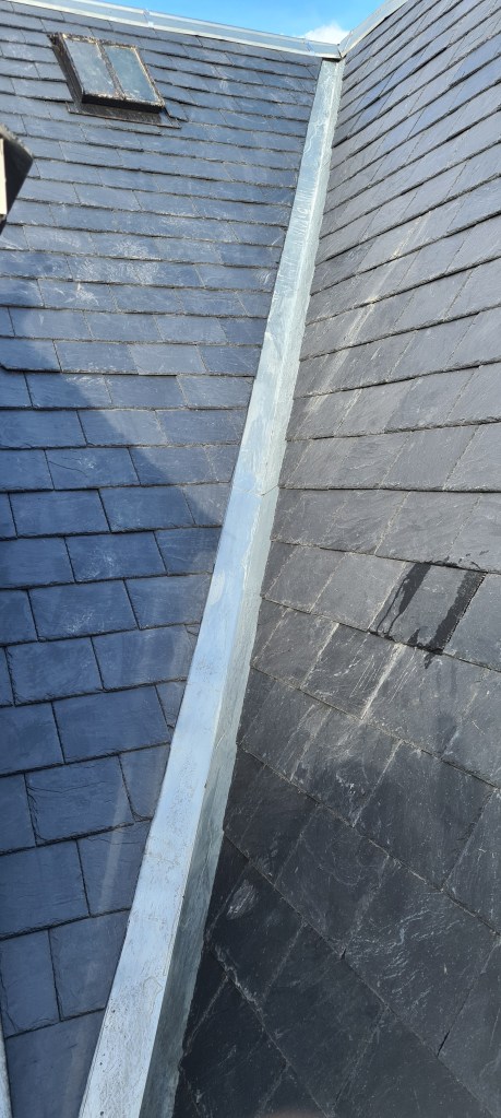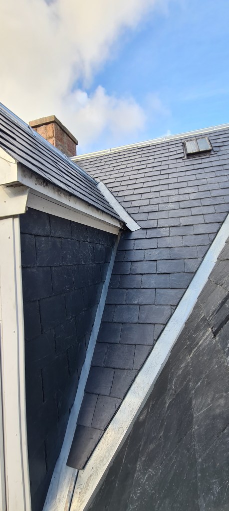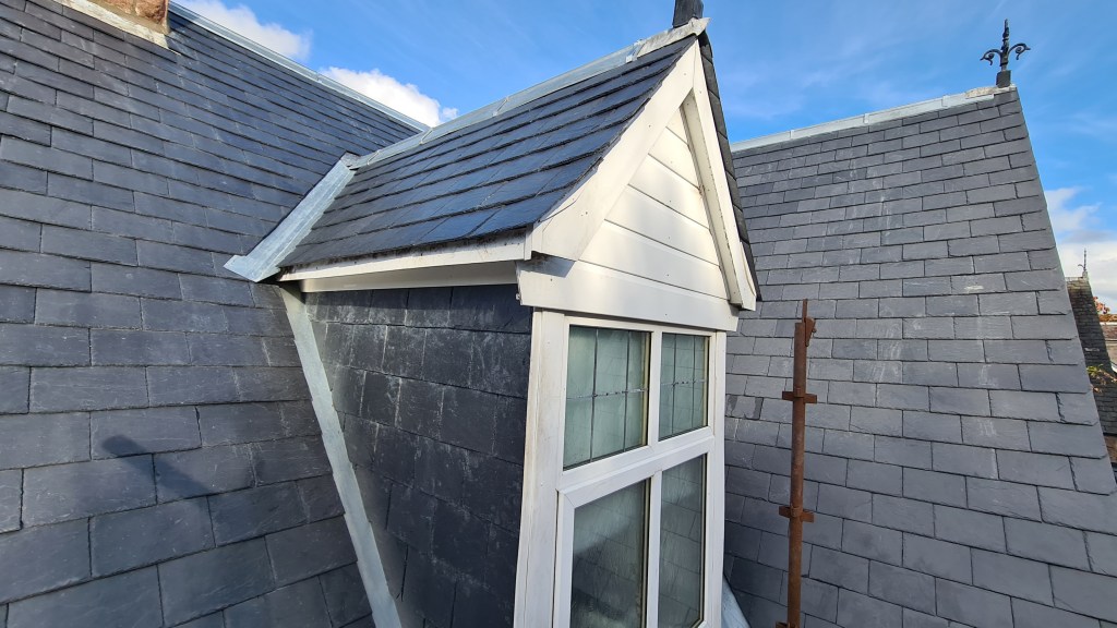 Re-slate of rear of house in Cults with Cupa slates and dormer window showing overlap slates on dormer roof. Zinc side slips and valley work with new Zinc ridge.